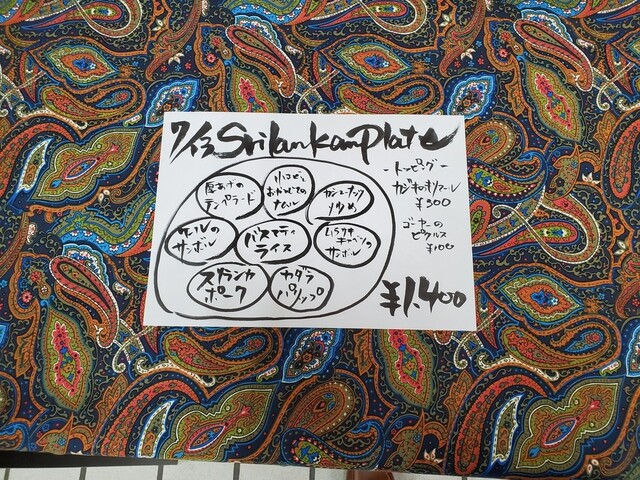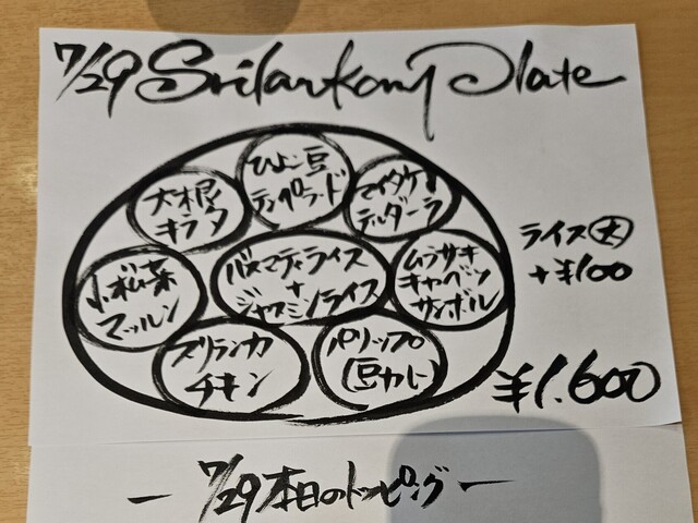 今日のランチプレートが絵で描かれています。本格的なスリランカミールスと日本の食材を融合させる店主の才能にはいつも感心します。
