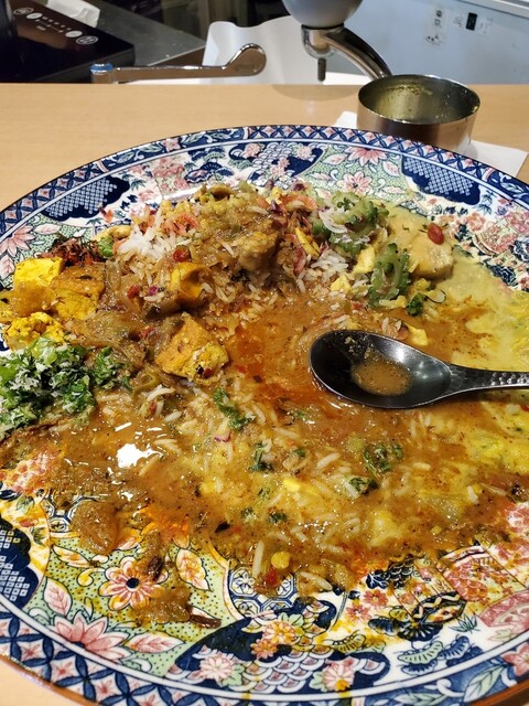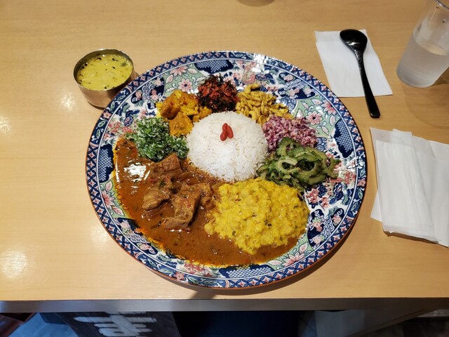 今日最も気になっていたトッピングのマトンキーマをプレートに移します。あえて「辛口」と書いてあっただけに、ひと口目から発汗する辛さ。でも、マトン好き、キーマ好きとしては最高に旨い。