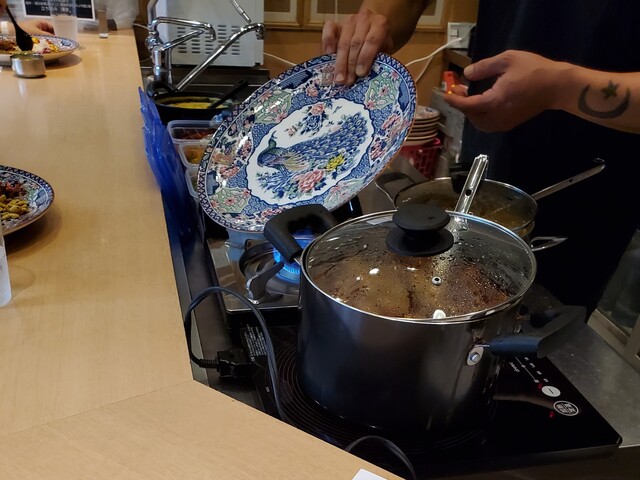 既に仕込みは出来ているので、さほど待ちません。イケメンの若い店主は、ちょっとヤンチャっぽいけど話すととても優しくて人当たりの良いナイスガイ。目の前の狭い厨房で大きな和皿をガスで温めています。カレーをアツアツで出そうという気配りが嬉しい。