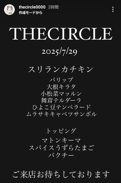 日替わりのスリランカカレープレートの内容説明は、いつも店主手書きのイラスト。それを眺めながら、今年2月以来の「THECIRCLE」に期待に胸が膨らみます。