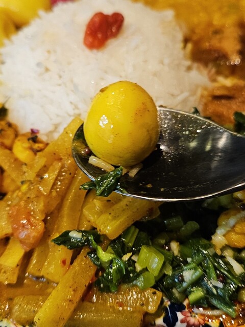 品切れで一部おかずが変わっているとのこと。小松菜のマッルン(しんなり炒め)は金柑のアチャールに、ムラサキキャベツのサンボル(和え物)はセルバチコとケールのサンボルにそれぞれ変更とのこと。ある意味、トッピングのオプションが色々食べられて良かったかもしれません。ポルサンボル(ココナッツふりかけ)、小海老テルダーラ(油炒め)、カシューナッツ炒めはそのままです。