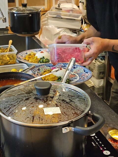 5、6人しか立ち食いできないので、回転は遅め。しかも、丁度入れ替わった直後だったようで、30分待ってようやく案内されました。トッピングで頼みたかった牡蠣のスリランカカレーは残念ながら売り切れだったので、発酵白菜のキーマカレーを頼みます。目の前で店主が大きな和皿におかずやカレーを手際よく美しく盛り付けてスリランカプレートを作っていきます。イケメンかつフレンドリーな店主が実にナイスで楽しいのも、この店のポイントです。