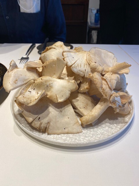 " ハタ " のロースト、蛤のソース、空心菜のフライ。