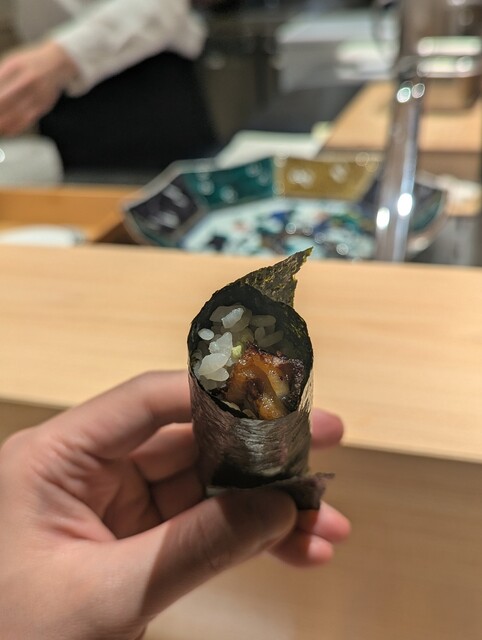 物語は一度、濃厚な深みへと潜行する。カワハギを肝で和えた巻物は、退廃的とも言えるほどに大人びた味わいだった。続く白子に焼き目をつけた軍艦。香ばしい焦げ目と、とろりとした白子の対比は、冷たい海の中で見つけた小さな熱源のようだ。日本酒が進むのは、もはや不可避な物理法則だった。