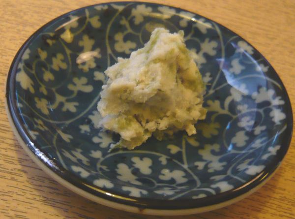とりあえず、ビンビール(一番搾り中ビン)とわさび漬け(200円)を注文。このわさび漬けがいける。ややシャーベット状でアイスクリームのようにねっとりした感触がなんともいえず舌触りがいい。味も悪くない。これならビールじゃなくて日本酒のほうがよかった。しかし、時間もないし、昼間から日本酒は少しきつい。