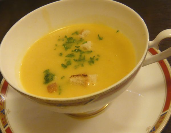 それから、スープ。あつあつでおいしいクリームスープだった。メインのステーキもやわらかくて量も少なめでよかった。
