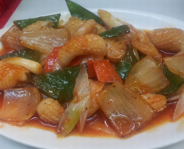 そろそろ餃子にも飽きてきたので、ビールのつまみに何かないかと考えていたところ、おねえさんが「クーニャンどう?人気ですよ」という。イカとエビと野菜の酢豚風の料理。まあまあか。