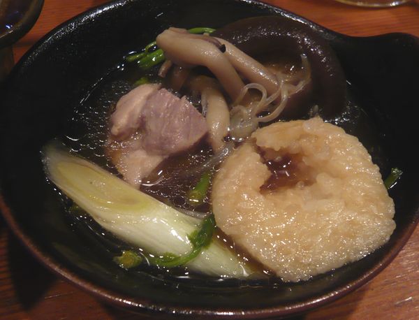 きりたんぽ鍋(1人前1600円)を食べてみた。マイタケ、シメジ、鶏肉、ネギ、シイタケ、ゴボウ、ネギ、キリタンポが入っている。具もすべておいしいが、スープがとてもいい。上に載っているのはセリだろうか?これがシャキシャキしててとてもうまい。3月までしか食べられないのが残念。