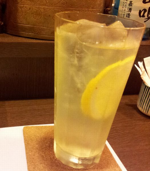 梅酒の炭酸割り。大きな梅干しが入ってる。