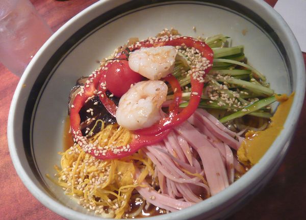 具はシイタケ、キュウリ、エビ、タマゴ、ハム、クラゲ、トマト。見た目も美しいし、味も普通の冷し中華とは違っている。さすがに摩天楼だ。