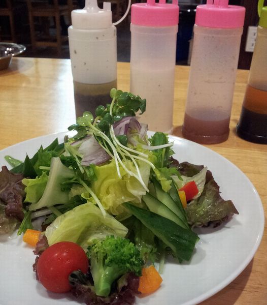 生野菜500円は値段は上がったが相変わらず4種類のドレッシングが出てくる。キムチ250円はいつでもあるわけではないらしいが、濃厚でうまい。 その他、谷中、にんにく揚げ、ロースカツを注文。