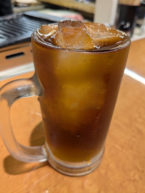 烏龍茶、カクテキ、ココロ刺しに上タン塩、上ハラミ(ワサビ醤油)にタレはハーフを2種(上バラと上ハラミ)