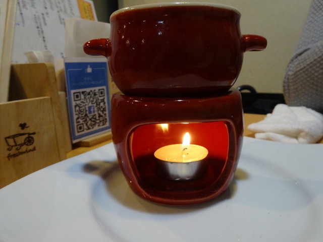 こんなアヒージョは初めて見ました。固形燃料で温めた状態で提供されます。
