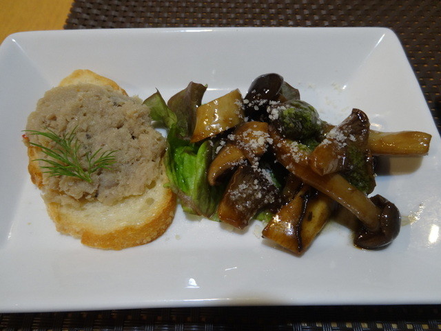 まずはお通しにパテとキノコ 小皿ですが一切の手抜きはありません、期待は高まります。