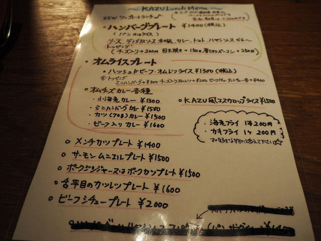 この日のオーダー、私は「KAZU風エスカロップライス」を海老フライトッピングで、妻は「ハッシュドビーフ・オムレツライス」をミニハンバーグトッピングです。