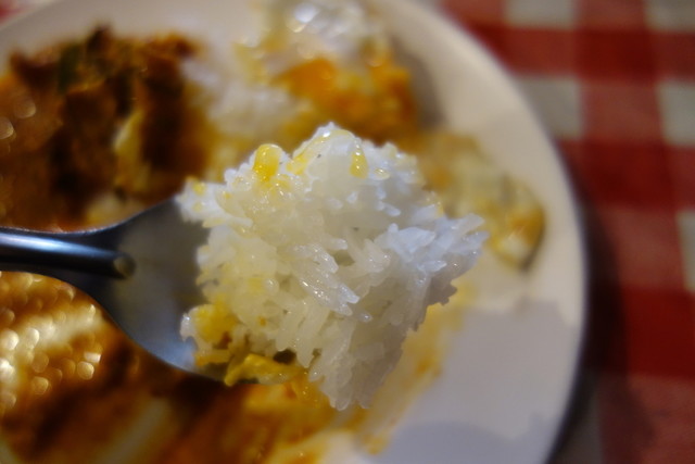 ライスはジャスミン米で、独特な爽やかさとパラパラとした食感が、甘激辛いこのカレーの美味しさを引き立てていたわ!やっぱりタイカレーにはジャスミンライスよね!?