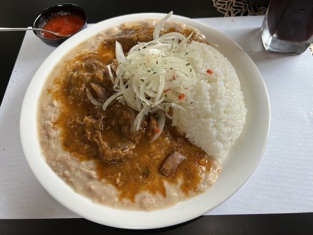 フリホーレスにかかっている茶色いシチューは、マトンの味がしてスパイスが効いていてインド系のカレーっぽい味がしたわ!