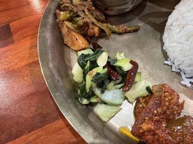 ジャガイモとインゲンとナスが使われたタルカリで、カレーに混じって肉味噌っぽい味がして、どこか中華風だったわ!