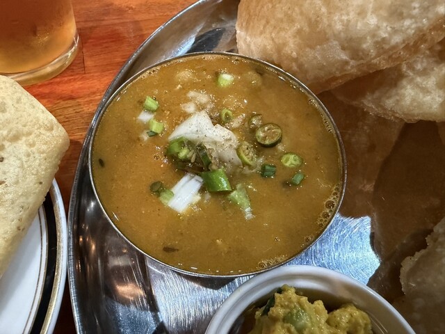 プーリーには、チャナマサラ(豆カレー)とアチャールが付いてきたわ!
