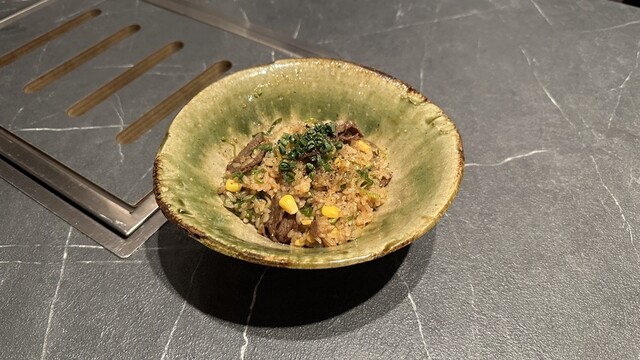 シソご飯にユッケがのって、卵黄と生カラスミと一緒に混ぜてたべるというなんとも贅沢な一杯!
