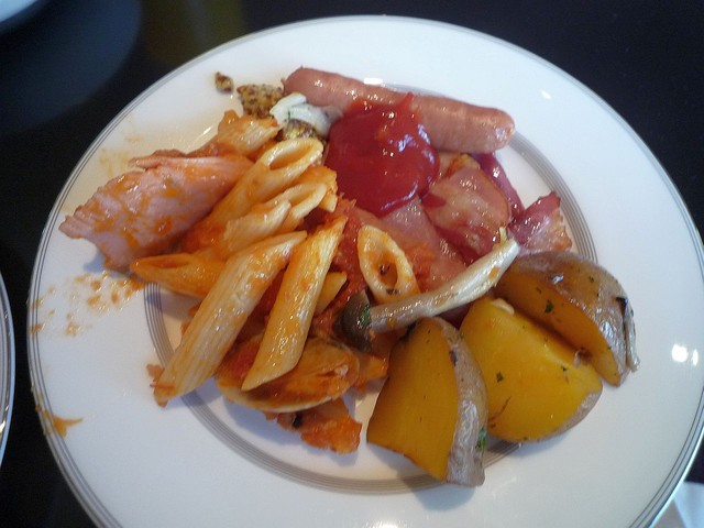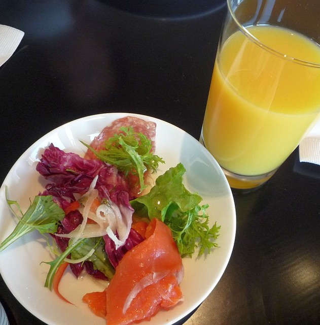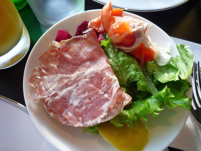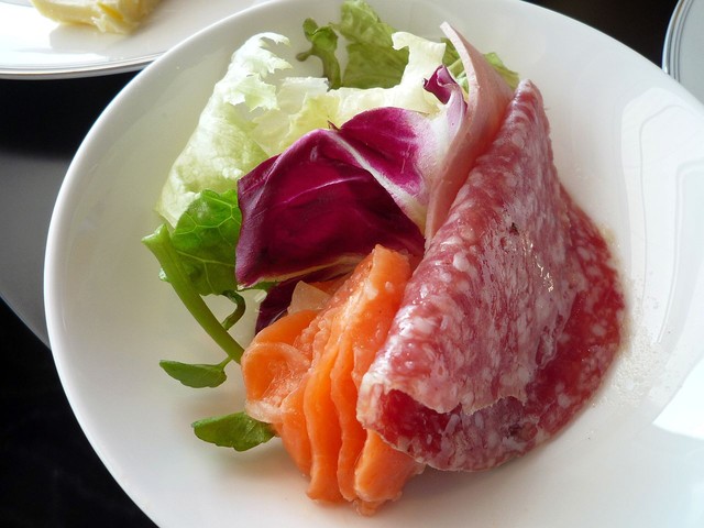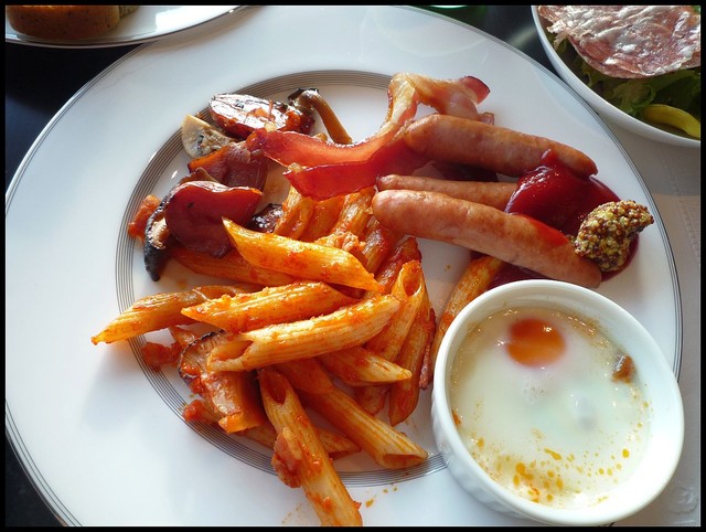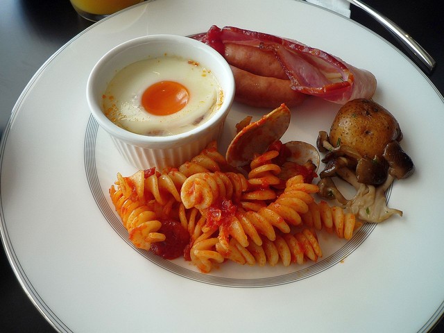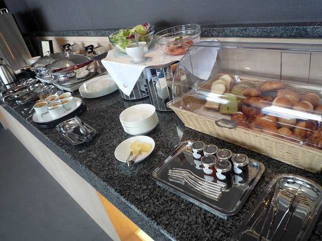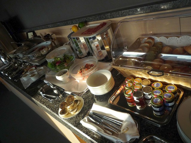 朝食は、ブレッド、サラダ、ハム、ソーセージ、スモークサーモン、パスタ、ボーチドエッグ、果物など食材にもこだわり朝食は満足でした。勿論、フリードリンクで。
