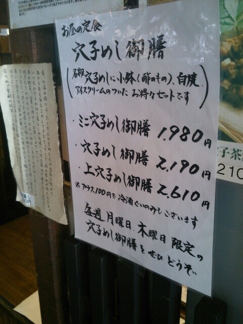 上穴子めし御膳 :2610円(穴子めし、小鉢、白焼,アイスクリーム。毎週月、木限定。2階のみ)