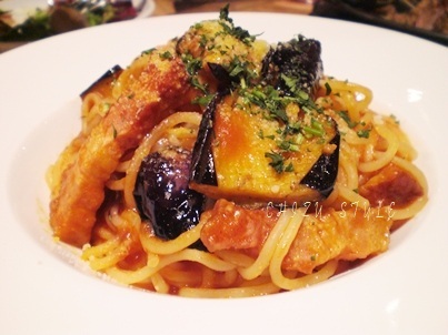 厚切りベーコンと揚げ茄子の
