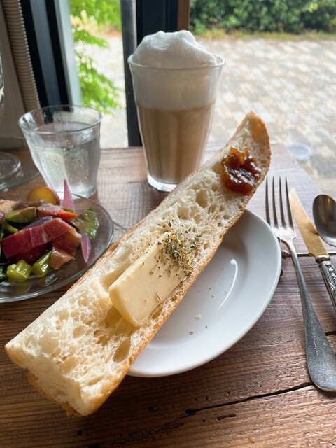 この日のお目当ては、毎年最も人気のメニューだというイチジクのジャスミン風味、茹で野菜とプロシュートハムのサラダ、それとハーブバター&イチジクジャムのロングバケット。飲み物は、モコモコ泡のカフェオレ。