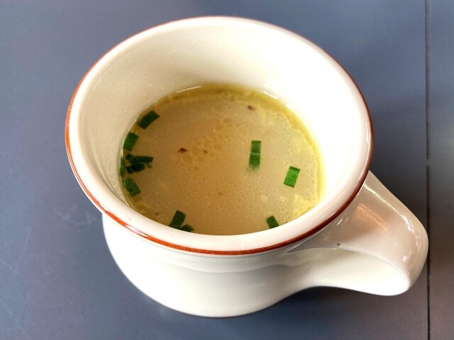 待ち時間に飲んだスープは、ニンニクがきいていて、旨味も濃厚。