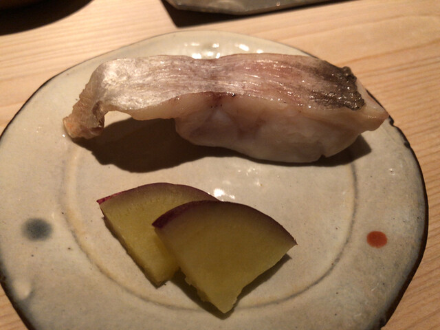まずは春子鯛。熟成が効いていてうま味がとても良い。シャリの大きさ、温度、酸味、塩味、ばらけ具合、すべてが良い感じ。