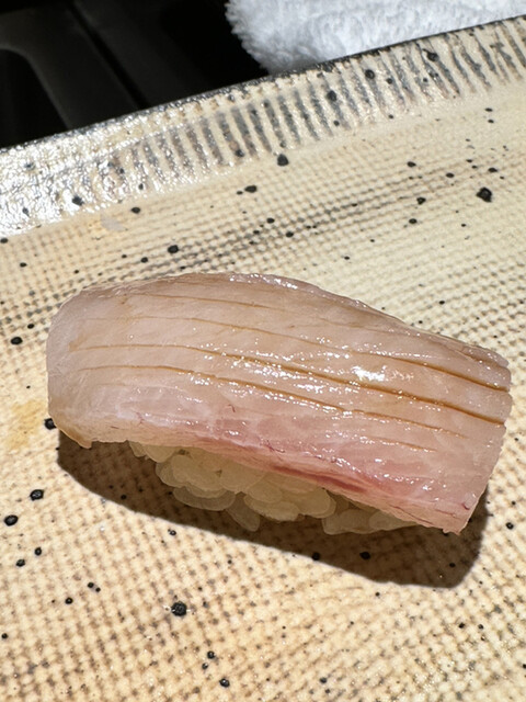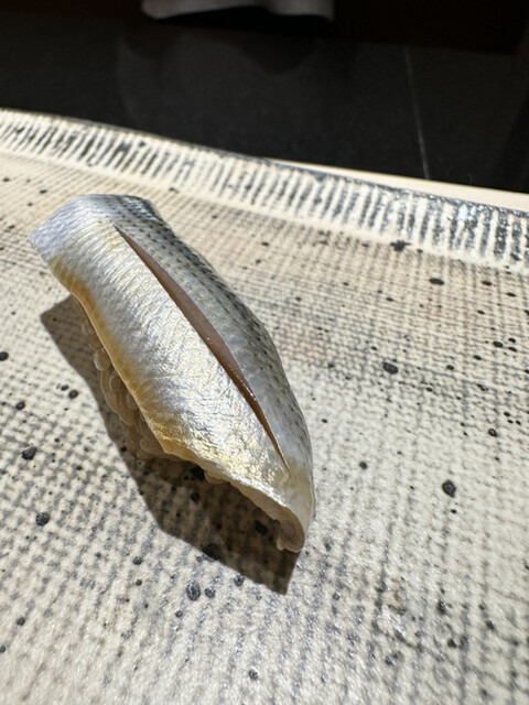 昆布〆カスゴ、さすが鮨 なんば 日比谷出身とあってしゃりの温度はドンピシャ。そしてほぐれ具合もすごくいい。昆布〆カスゴの旨味を引き出してくれています。