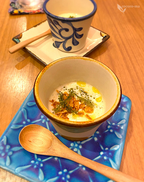 お通しは冷たいポタージュスープ(ヴィシソワーズ?)で、