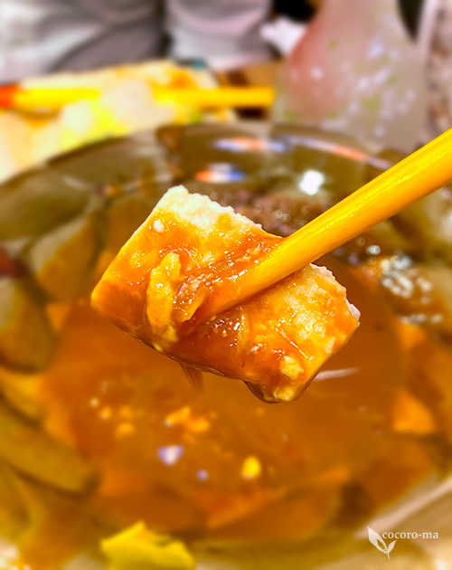 「島豆腐」を単品で提供していただき、先ほどの「ラフテー」の煮汁につけて食す模様。