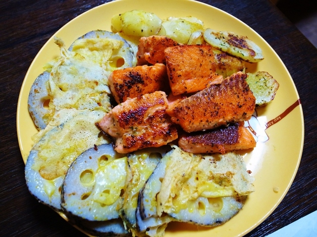 サーモンのハーブソテーとレンコンのチーズ焼き