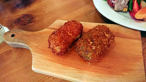 キノコのソテーが添えられており、マスタードや黒胡椒などをつけて一緒に食べるようです。