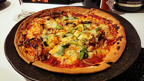 ふっくらしたピザの生地の上には、香りが豊かな九条ネギと甘辛いゴボウが乗っていました。