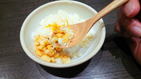有機卵黄にすでに塩味がついているので、ごはんと一緒にそのまま食べてくださいとのことでした。