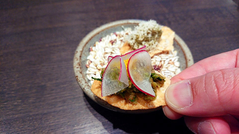えびのチップスの上には、赤カブやアボカドのペーストなどが盛り付けられていました。