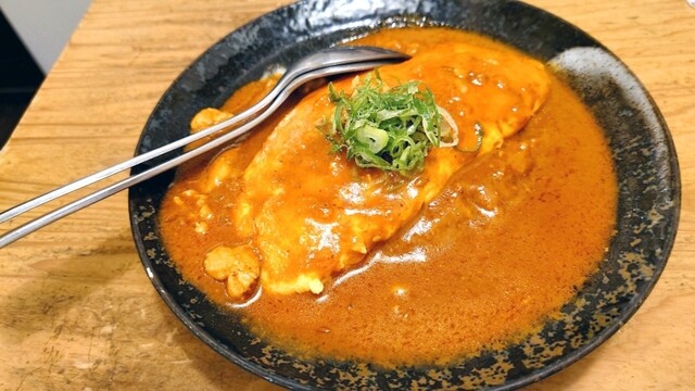 基本の「チキンカレーリゾット」に、オムレツを乗せてルーをかけたお料理です。