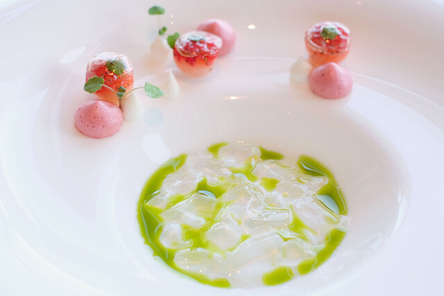 ランチコース 19800円 のボタン海老 林檎シャーベット 西洋わさびムース