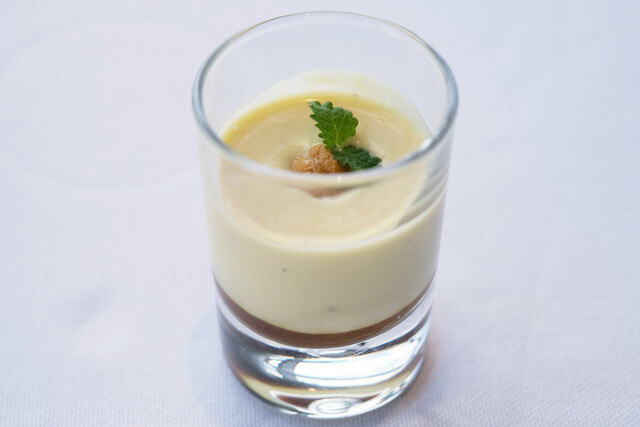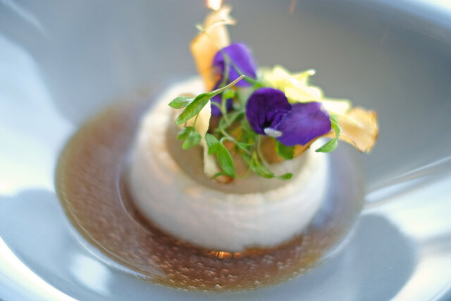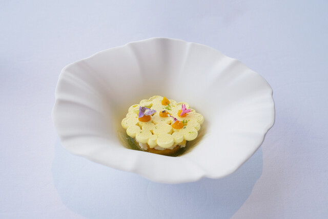 ランチコース 19800円 のトウモロコシのフラン 雲丹添え