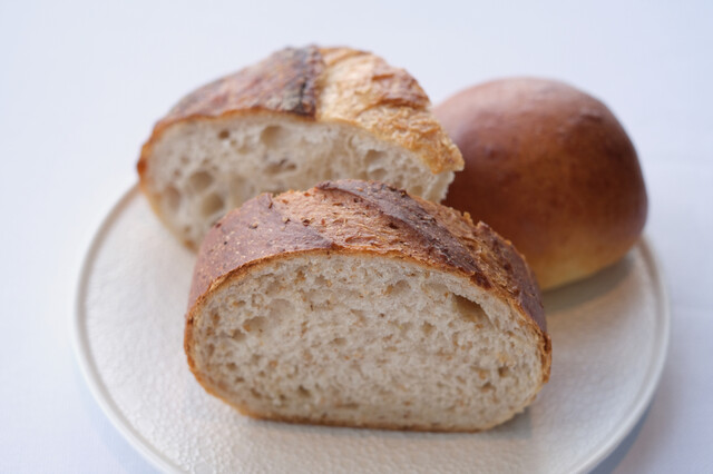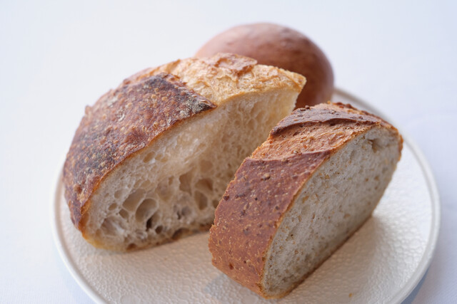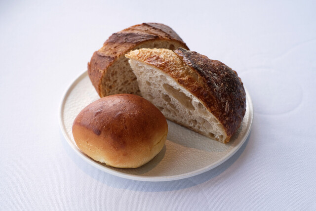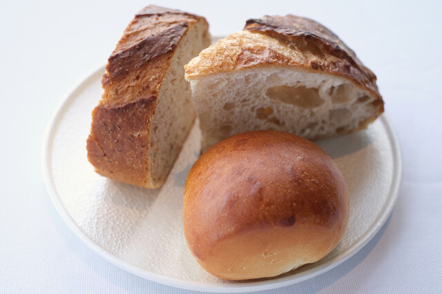 パン、アミューズ3品、スープ、前菜2品、魚料理、肉料理、デザート、カフェのコースです。