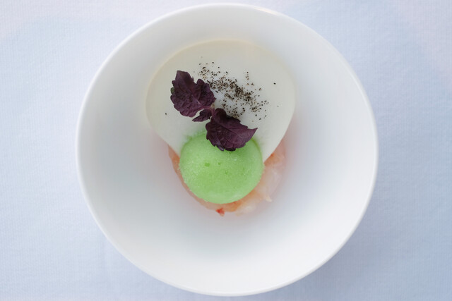ボタン海老 林檎シャーベット 西洋わさびムースで、