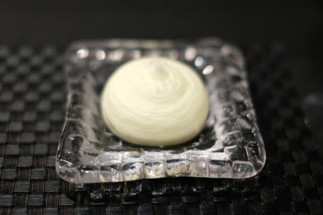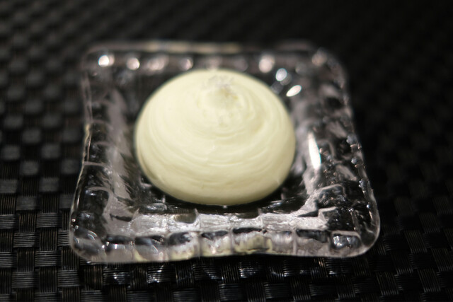 「新玉ねぎ」と「生雲丹」のパルフェが彩り美しく複雑な味わいでとても美味しいです。