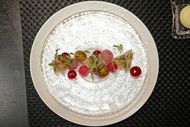 ランチコース 7865円 の勝浦のかつお 赤色の野菜 ビーツ アマランサス 赤しそ