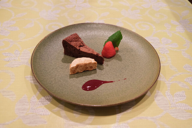 プランツォB 2000円 のアプリコット入りチョコレートのタルト、ヘーゼルナッツのアイス、苺