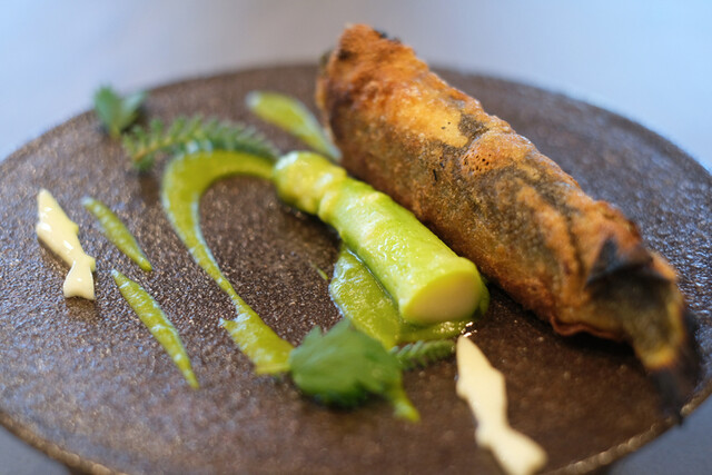 鮎のコンフィー、鮎の内臓、青海苔、ニンニクでエスカルゴバターのように中に詰め