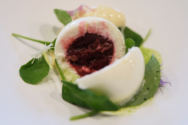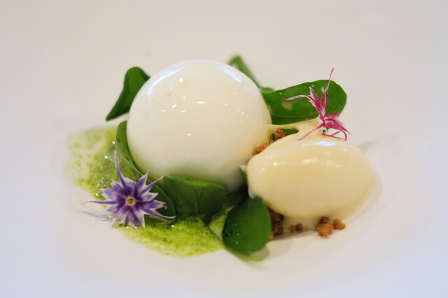 ヨーグルトのソースと液体窒素の山葵を使ったソースと