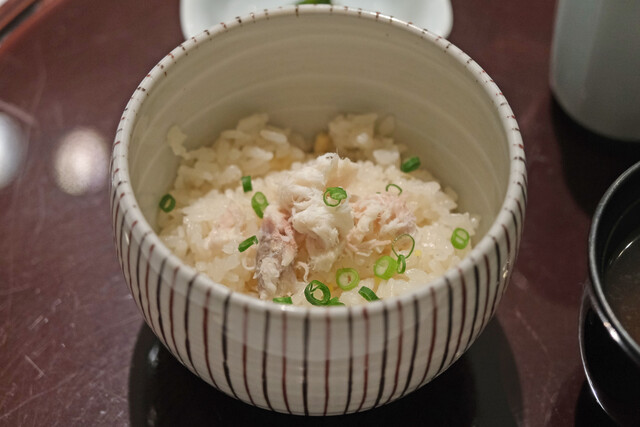 真鯛のご飯、味噌汁、香の物、ほうじ茶で