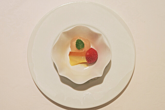 ランチコース 3500円 のカスタードプリン、苺ミルクの餡入り葛餅、苺
